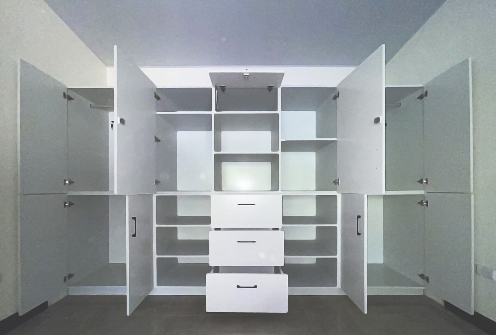 todo con sus respectivas puertas, gavetas y estantes.